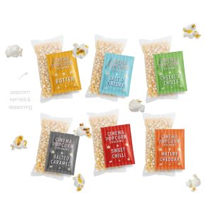Each box of our Popcorn Seasoning Kit Crackers contains 6 crackers each with a sachet of popcorn kernels and a sachet of gourmet seasoning, a joke, a colourful hat and snap.