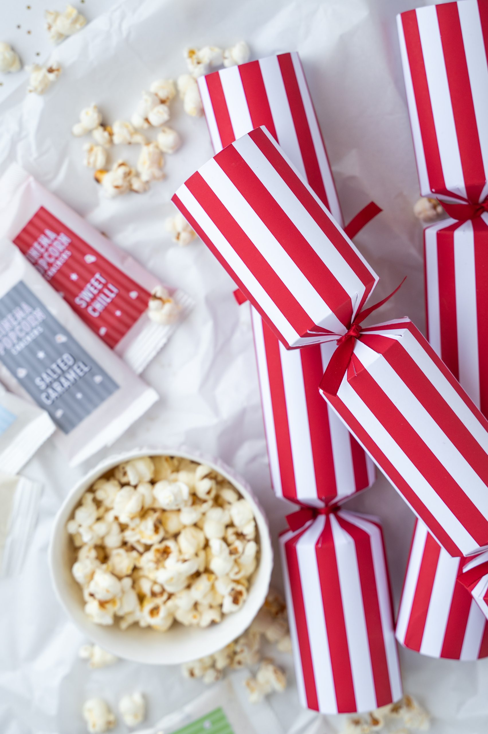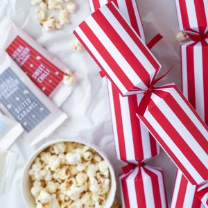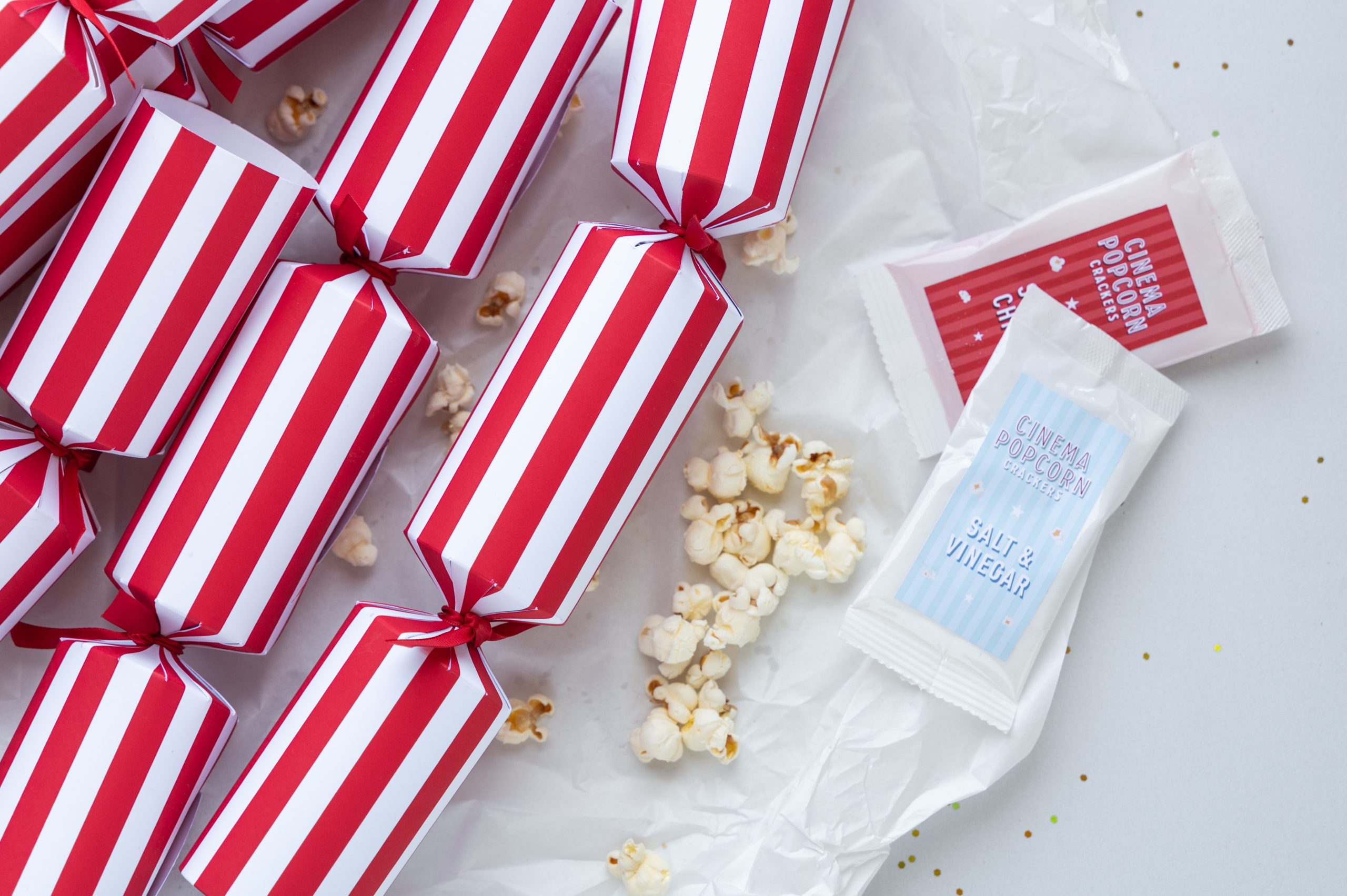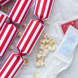 Each Christmas cracker contains popcorn kernels and gourmet seasoning, a joke, a colourful hat and snap.