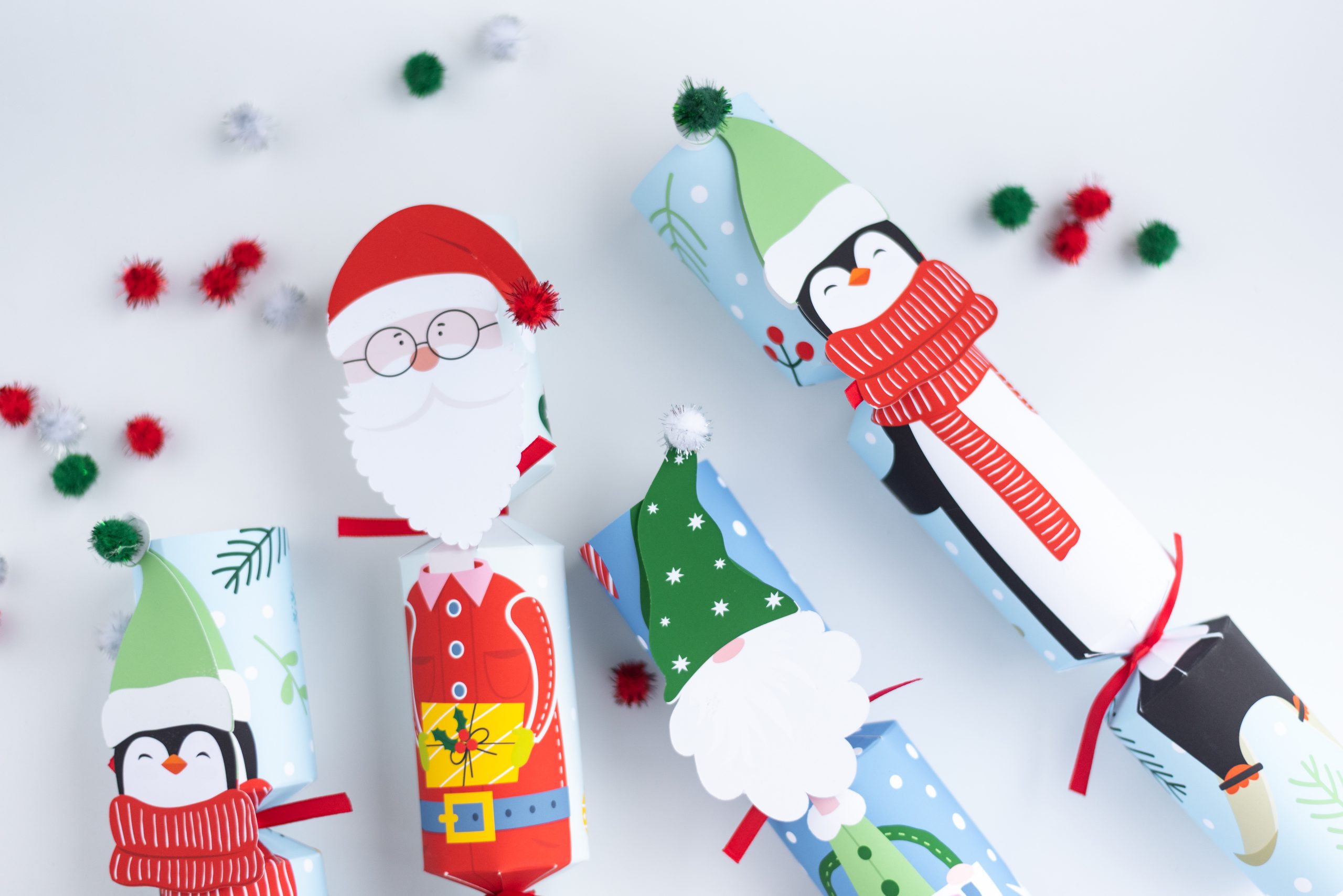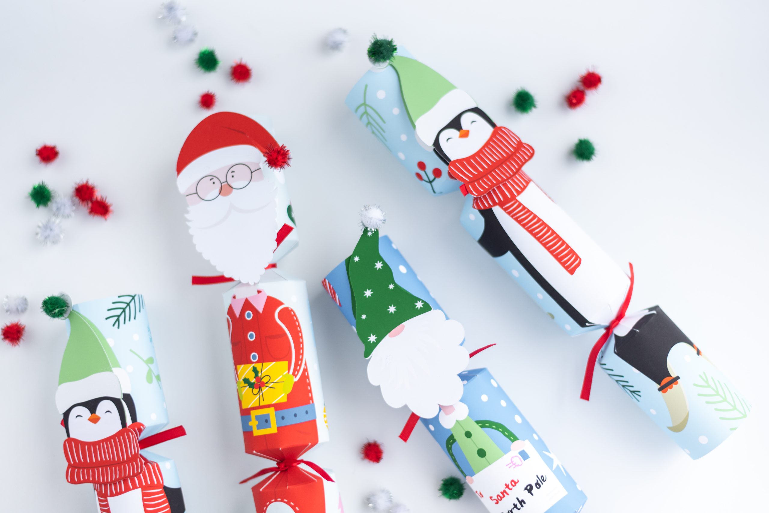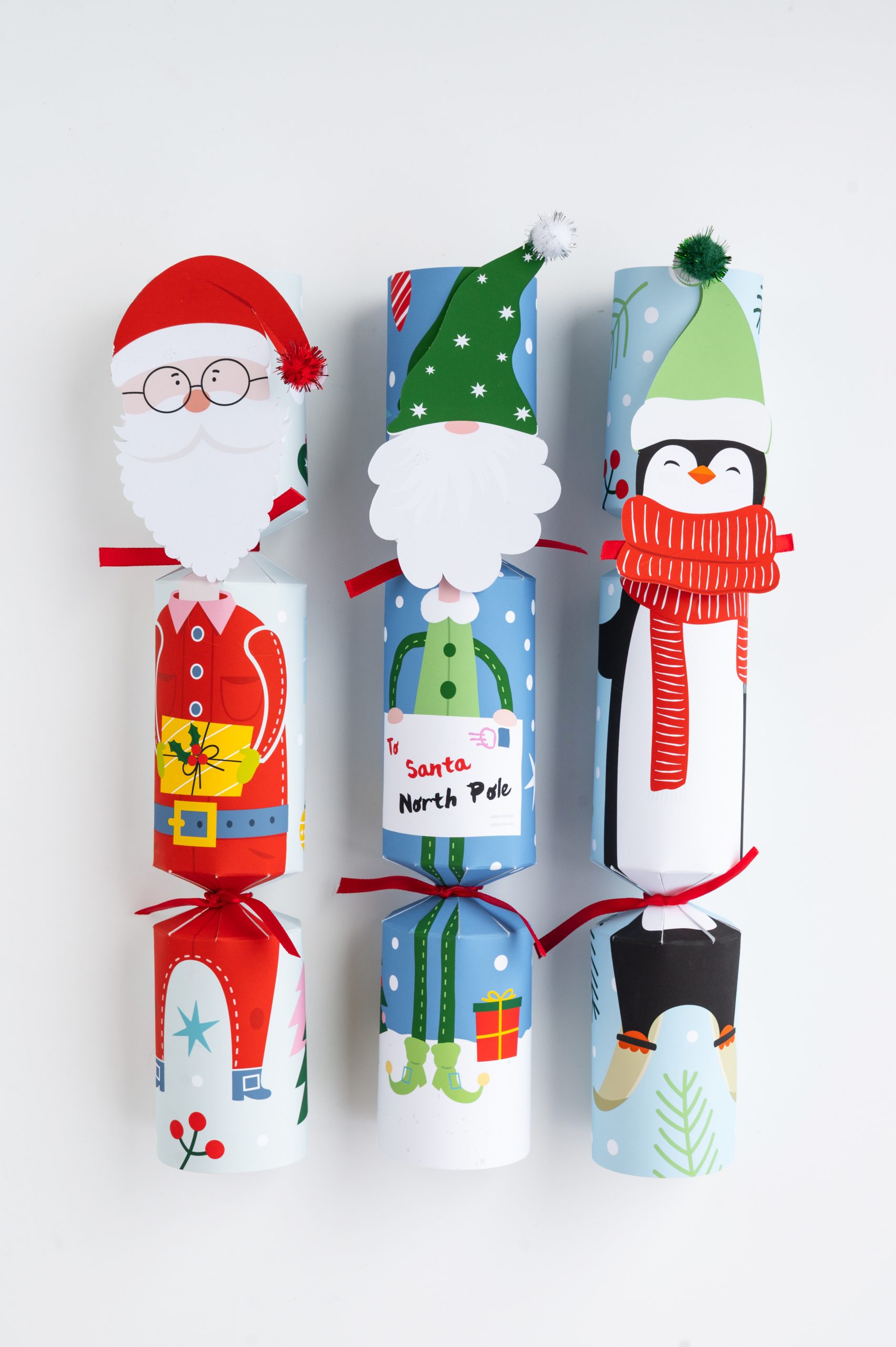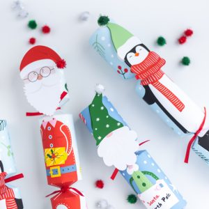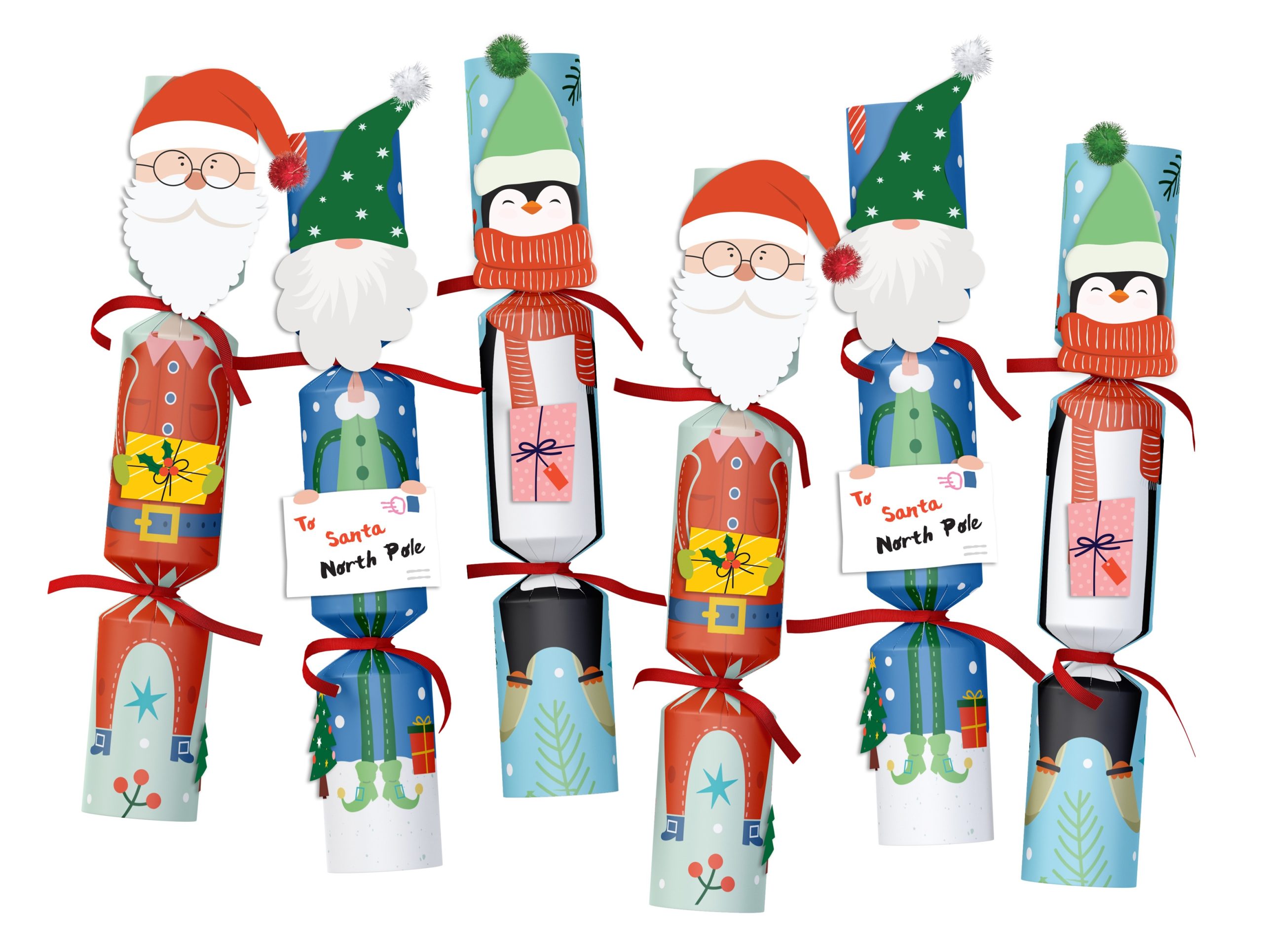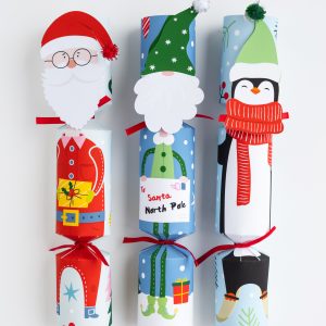 Each box contains 6 x crackers, 6 x character faces, 4 x presents, 2 x letters, 6 x pompoms, 12 x ribbons, 6 x snaps, 6 x jokes, 6 x hats